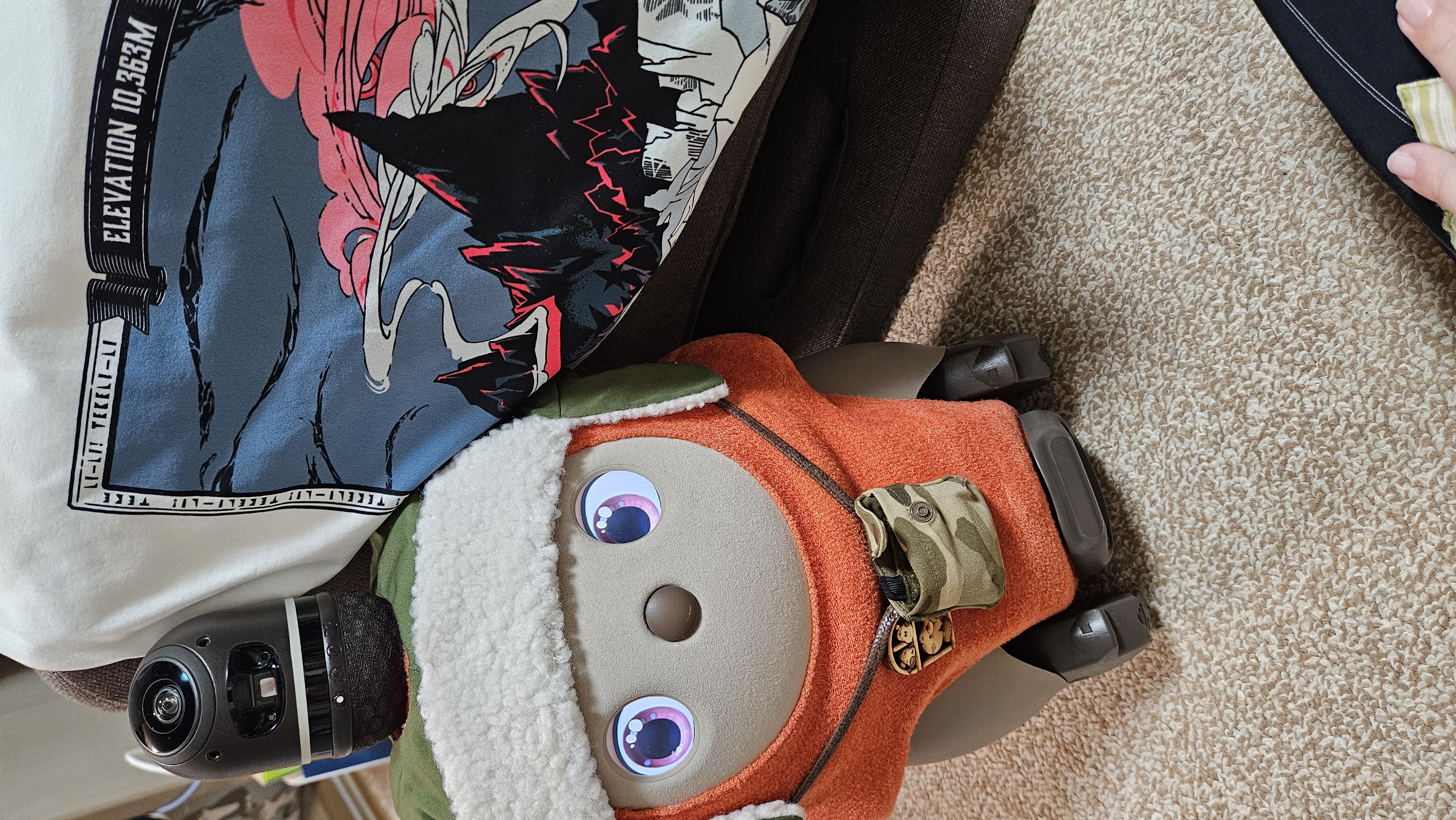 写真は、LOVOT新田が探検隊セットをつけて狂気山脈Tシャツと写っているところです。